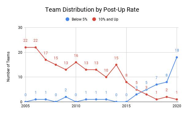 This will be the sixth consecutive season with fewer post-ups than the last, and 2019-20 is on pace for the largest post-up drop-off in more than a decade. The reasons for the play’s excision are all tied together, a result of both rule and strategic changes that have encouraged the rise of Moreyball. (Another fun excerpt from that 2015 Lowe column: He wrote that the post-up death “evokes both wistfulness for the past and a fear that the NBA is heading toward a homogeneity in which every team drives for corner 3s, layups, and free throws. What happens if we all play Rocketball?” Welcome to the NBA in 2019!)