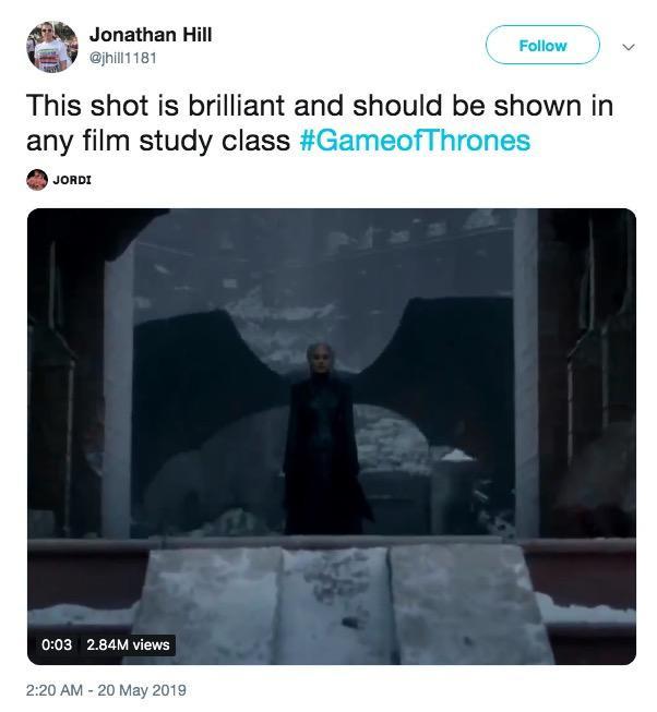 Ben Lindbergh: The final season of Game of Thrones deeply disappointed on a narrative level, but it did deliver memes until the bitter end, including Staring Bran, Sansa Stark Vaping, wayward coffee cups and water bottles, and my personal favorite, This Shot Is Brilliant. After the finale, Twitter user @jhill1181 tweeted an image from the episode of Daenerys framed by Drogon’s wings, accompanied by the caption, “This shot is brilliant and should be shown in any film study class.”