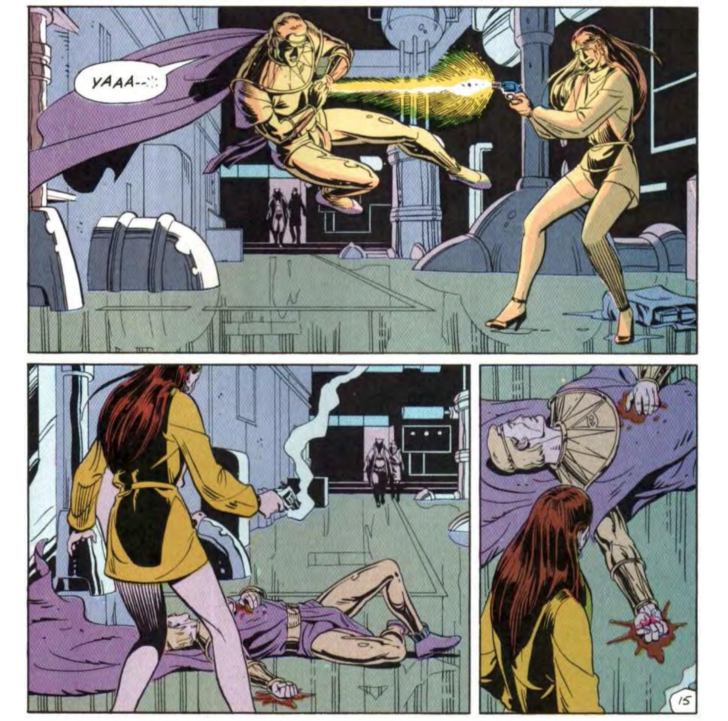 Following the casual massacre, Doctor Manhattan—touching the pool of Keene’s blood—teleports Adrian, Wade, and Laurie to Karnak, leaving Angela behind as his death approaches. Enraged that Doctor Manhattan shipped off her father before she could properly gloat about her success, Trieu fires up the centrifuge to extract his energy.