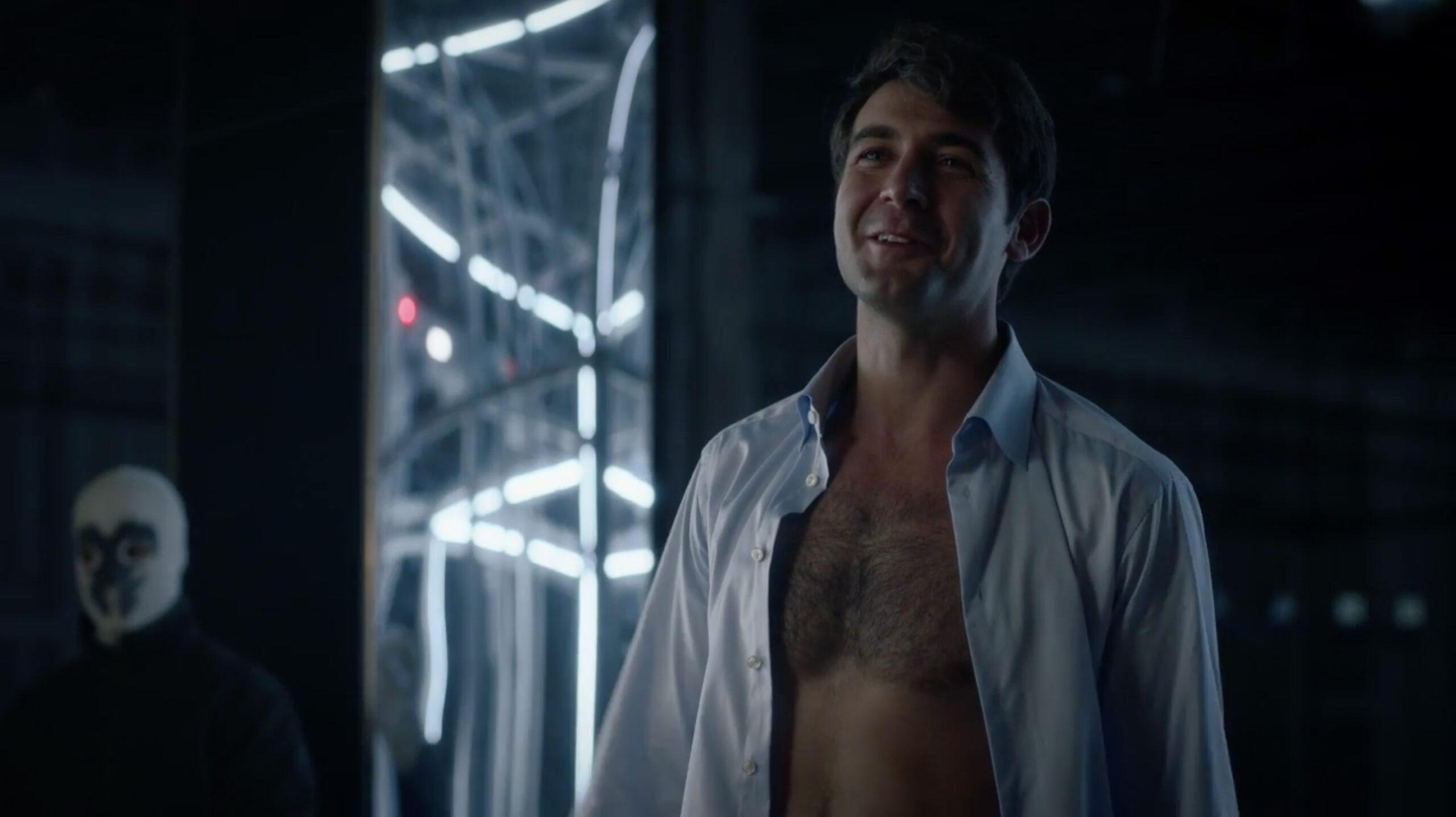 Meanwhile, the Seventh Kavalry is also preparing to steal Doctor Manhattan’s powers, though they’re completely unaware that they’re playing right into Lady Trieu’s plans. Senator Joseph Keene Jr. has gathered the senior leadership of their white supremacist organization, including his father and Jane Crawford. Agent Laurie Blake is there as well, still held captive as they all await her ex-boyfriend’s grand entrance, and Wade Tillman—who had been missing ever since a group of Kavalry members failed to kill him in his home—has managed to sneak into the warehouse wearing one of the Kavalry’s trademark Rorschach masks. Doctor Manhattan is teleported into a synthetic lithium cage they’ve constructed using old watch batteries (a painstaking task that we witnessed a glimpse of all the way back in the series premiere), catching us up to the moment he disappeared outside of the Abars’ home at the end of the previous episode. The cage functions similarly to the tachyon particles that limit Doctor Manhattan’s abilities, confusing his sense of time; inside the cage, he starts repeating lines of dialogue he said decades earlier, in the pages of the graphic novel. With the dazed blue god imprisoned, Keene addresses his audience, outlining the Kavalry’s plan.