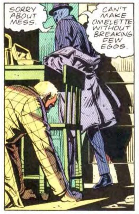 Doctor Manhattan’s hugely important omelette idiom was actually used in the graphic novel as well, only then it was said by Rorschach. After Rorschach interrogates the retired supervillain, Moloch, he swallows a raw egg and says the line on his way out the door: