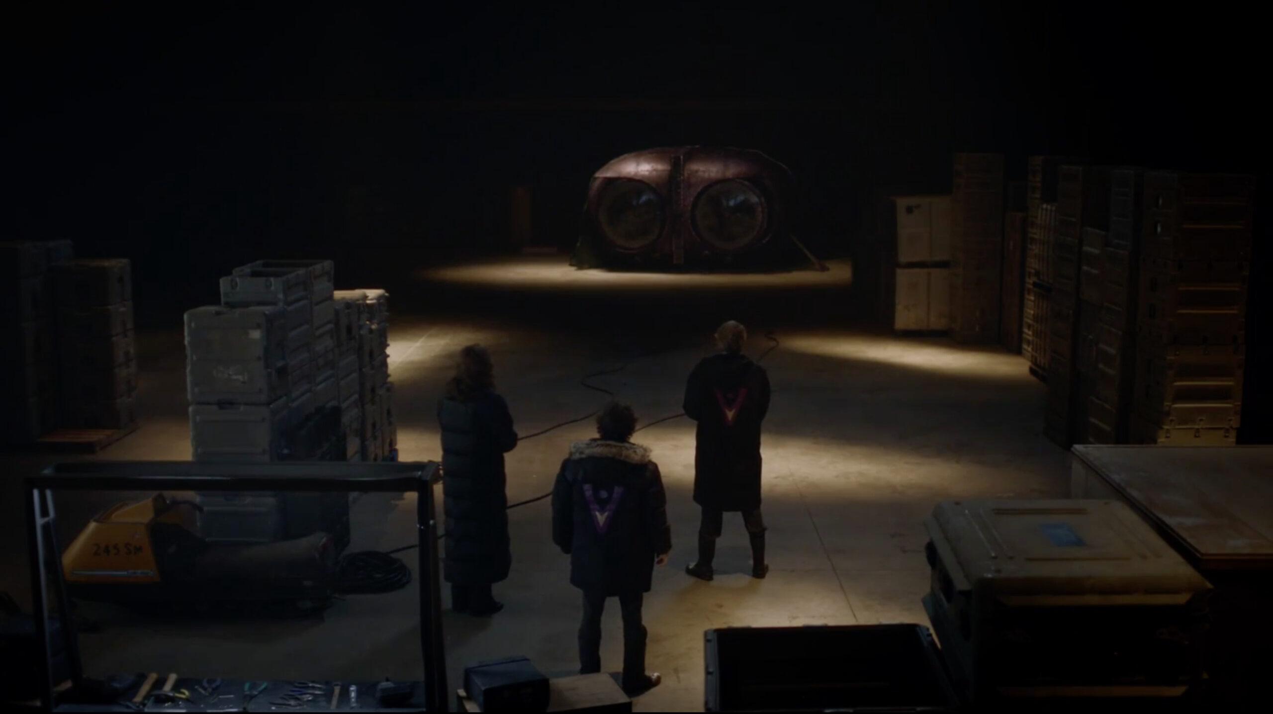 After Adrian saves the world from his daughter’s attempt to become an all-powerful god, he leads Laurie and Wade to the vessel that would bring them back to civilization. The ship is called Archie, as Laurie recalls fondly, and it’s the original ship that her ex-boyfriend Dan Dreiberg designed and used back in his days masquerading as the second Nite Owl. In the comics, Dan and Rorschach flew to Karnak in Archie on 11/2 to try to stop Adrian’s attack of New York. The ship has been collecting dust ever since, and now Laurie and Wade will use it to bring Adrian in to finally answer for his crimes.