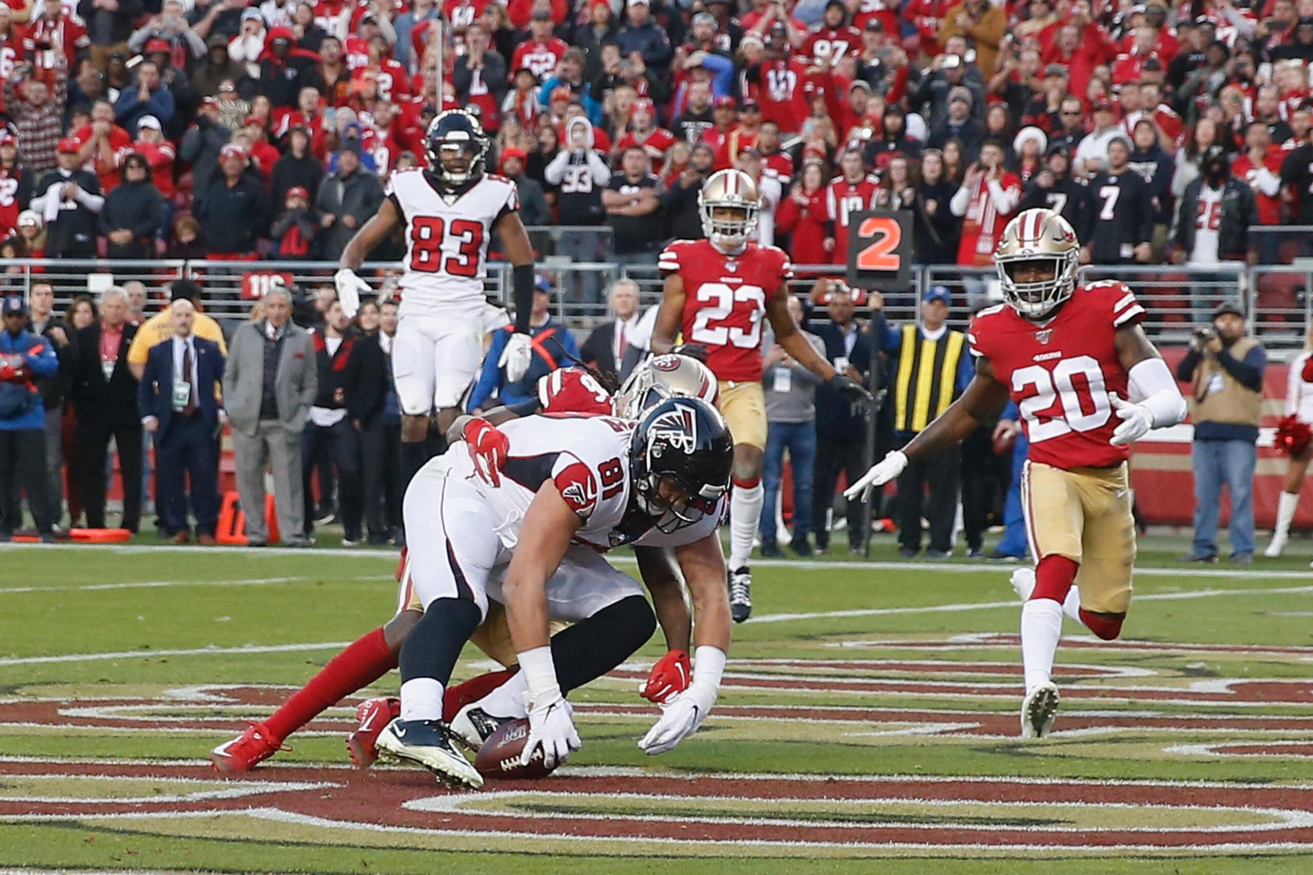 With the Falcons trailing 22-17 and less than two minutes left in the game, Matt Ryan engineered an eight-play, 65-yard drive to the Niners’ 5-yard line. With just seconds remaining, he hit Austin Hooper in the end zone, and, well, you tell me whether this is a catch: