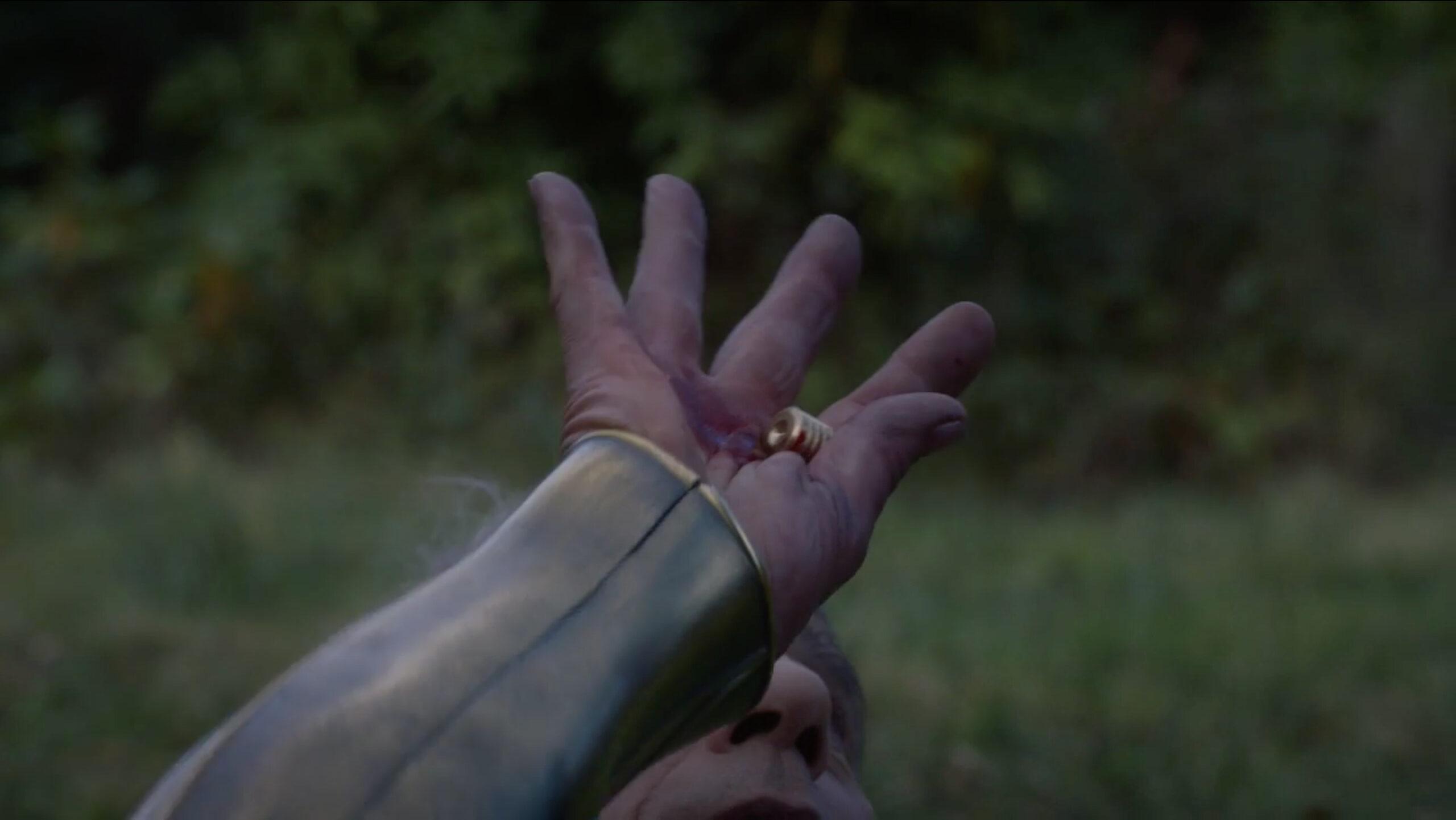 Back on Europa, we return to our favorite interplanetary castaway, now eight years into his life in “paradise.” And at long last, help has finally arrived. A spacecraft lands on the castle grounds, and Adrian exits his cell through an underground tunnel he’s dug. He kills the Game Warden, who was trying to prevent his master from deserting their moon one last time, before walking past all his servants to enter his shuttle back to Earth. As he steps into the spacecraft and the ship enters space, the sign Adrian carved out of his servants’ bodies in Episode 5 is revealed in full: “SAVE ME DAUGHTER.” In full Star Wars fashion, Adrian is essentially frozen in carbonite for the duration of his space flight, solidified as the gold statue that’s been standing in Trieu’s vivarium all along.