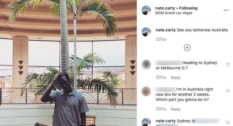 As the day drew closer, Nelson decided not to go. Carty, meanwhile, told the court that he had tried to back out after a man who called himself “Phil” instructed him to pick up luggage in Vegas before traveling to Australia. “I didn’t get a threat until when I was trying to back me and Kyle out, like four days before leaving,” Carty told the Australian Federal Police in an interview after he was arrested. “Basically, they weren’t specific on it. They were like, ‘This is not good. This guy’s really mad and, like, this doesn’t look good for you’–type stuff.” (Throughout our conversations, Slava insisted he never threatened anyone; it isn’t clear whether Carty was referring to Slava, Lalji, “Phil,” Trey, or another party.) At the time, Carty’s career was on an upswing; he told the court he was making up to $20,000 a month, and had landed gigs with Adidas and Coca-Cola. He told Australian law enforcement that the sole motivating factor for going through with the trip was that he was scared.