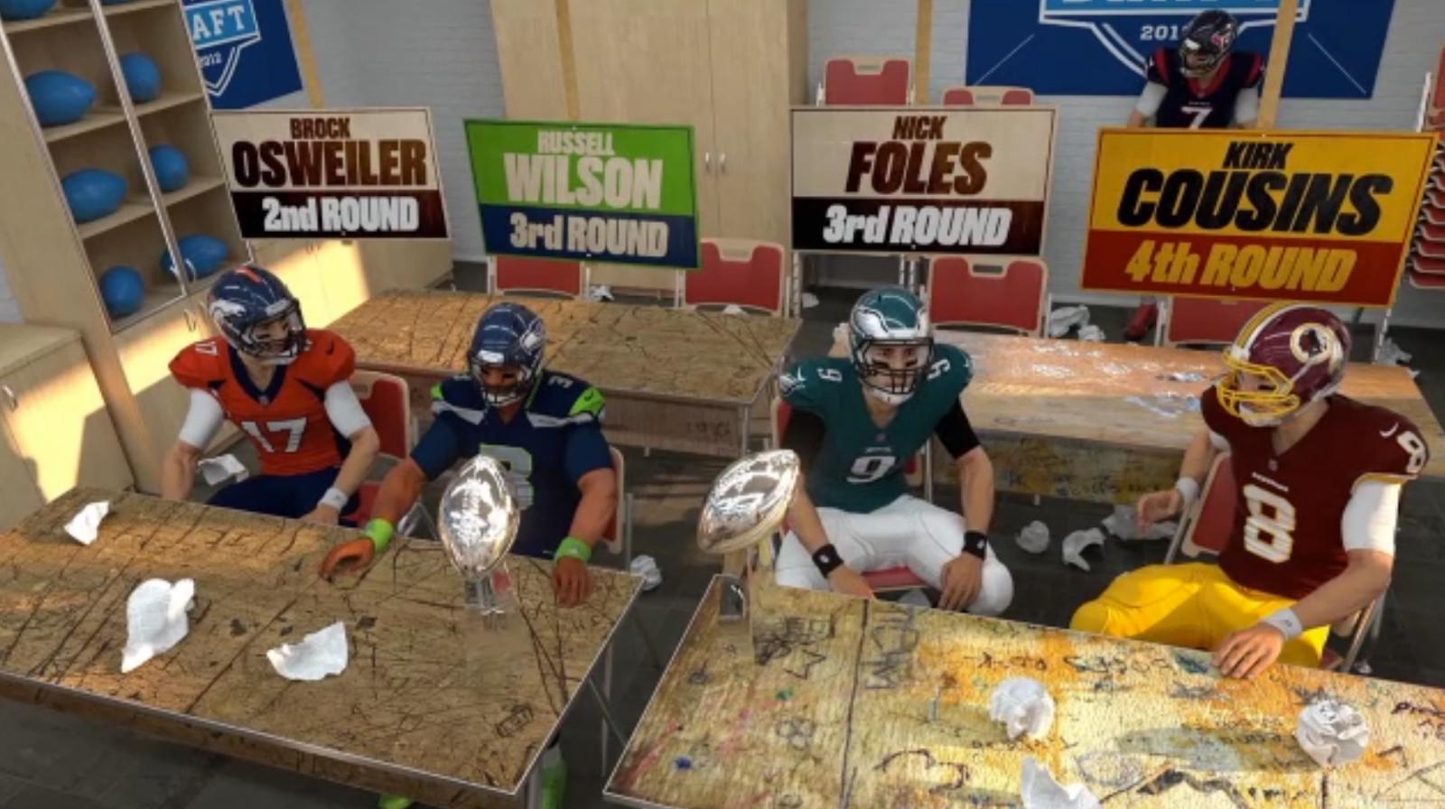 “It’s so good on so many levels,” Tessitore says. Indeed, this is the richest of many rich texts. The first round QBs from that class—Andrew Luck, Robert Griffin III, Ryan Tannehill, and Brandon Weeden—are sitting in the front row. Two of those players are retired. Two are going to play for AFC playoff contenders in Week 17 (Robert Griffin III is Lamar Jackson’s backup). Brock Osweiler, Russell Wilson, Nick Foles, and Kirk Cousins—the QBs taken in later rounds of that draft—sitting behind them just makes it more surreal. But it was poor, undrafted Case Keenum standing alone against the wall that drew the attention and adoration of Booger McFarland.
