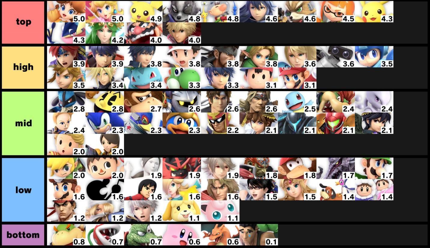 Sternke is the standard-bearer of the approach that mines the expressed preferences of pro players. “Since Ultimate only came out a few months ago, opinions on the tier list are extremely varied and debates on character strength are frequent and extended,” he says. “Since there hasn’t been any official tier list released yet, I thought I’d take it upon myself to average together all the pros’ tier lists I could find to fill that gap for now.”