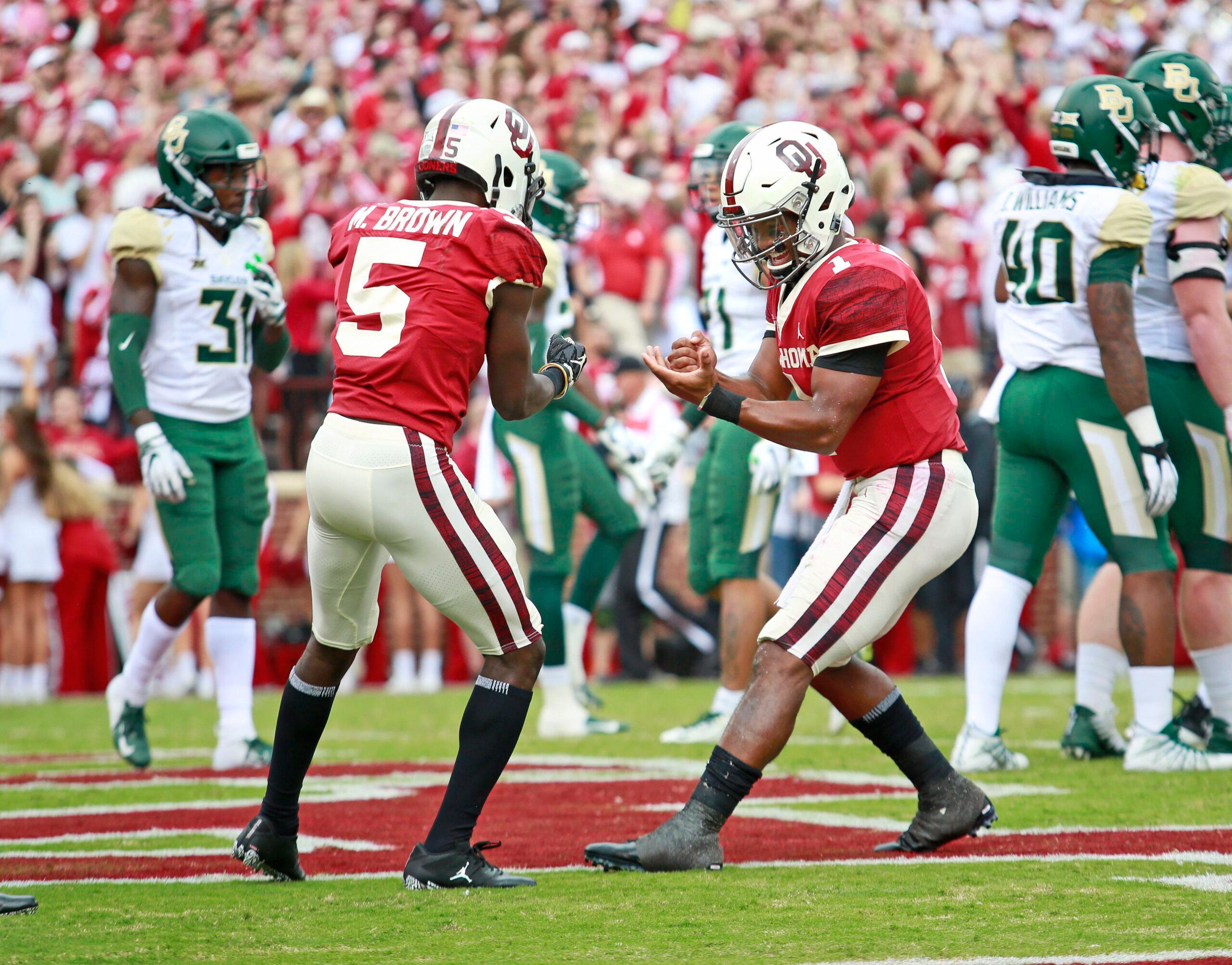 Brown’s respect for Mayfield made the QB’s halftime endorsement all the more powerful. And after his dominance against the Wildcats, the scrawny receiver took flight. Two games later, in just his second career start, he exploded for 265 yards and two touchdowns in an aptly named Bedlam win over Oklahoma State. The second of those scores came in the fourth quarter, with the Sooners ahead 48-45. As Brown broke free in the secondary and Mayfield found him deep down the right side, announcer Gus Johnson howled, “Hollywoooooood” as the kid from Hollywood, Florida, tore down the field for a 77-yard touchdown.