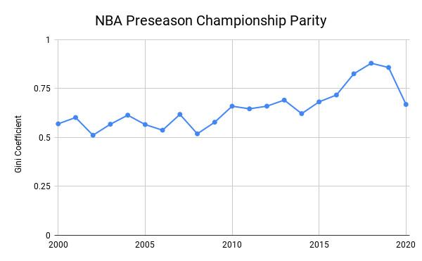 The same sort of finding appears with another test of parity: the Gini coefficient, which is a tool economists use to measure income inequality in a civilization. Gini works on a 0-1 scale in which 0 means everyone is perfectly equal, and 1 means one person holds all the society’s wealth. (The United States, for reference, is around 0.5 on this scale, which is near the high end of the known world.) We can use the same calculation here to determine the (in)equality in the distribution of the league’s title odds.