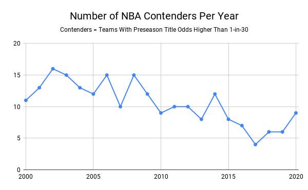 This graph comes with the caveat that, again, Vegas might have changed the way it doles out odds, which could explain some of the decline over the past half-decade. Yet the trend line is also fairly clear: Even if 2019-20’s contender pool is relatively larger compared to the seasons with Durant on the Warriors, it’s still small when viewed through a wider lens.
