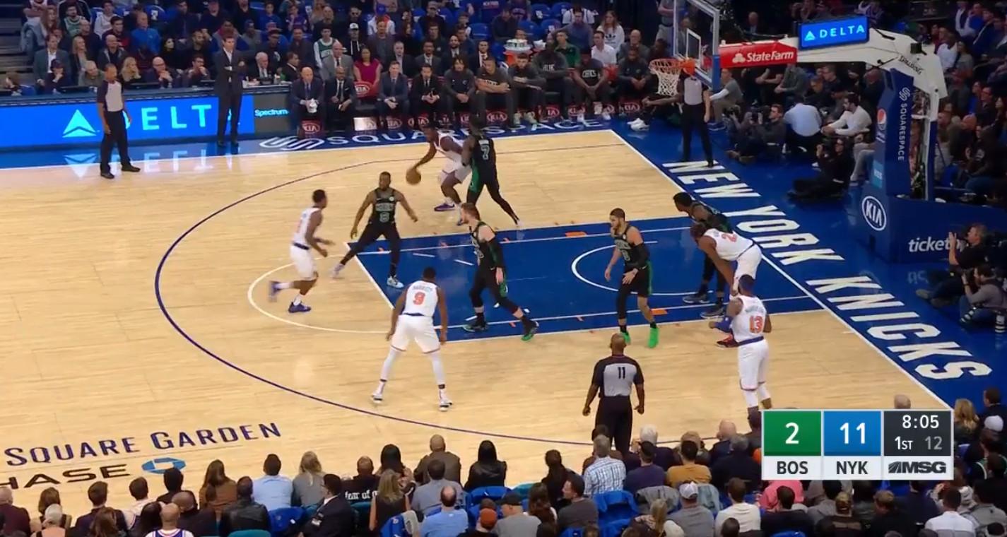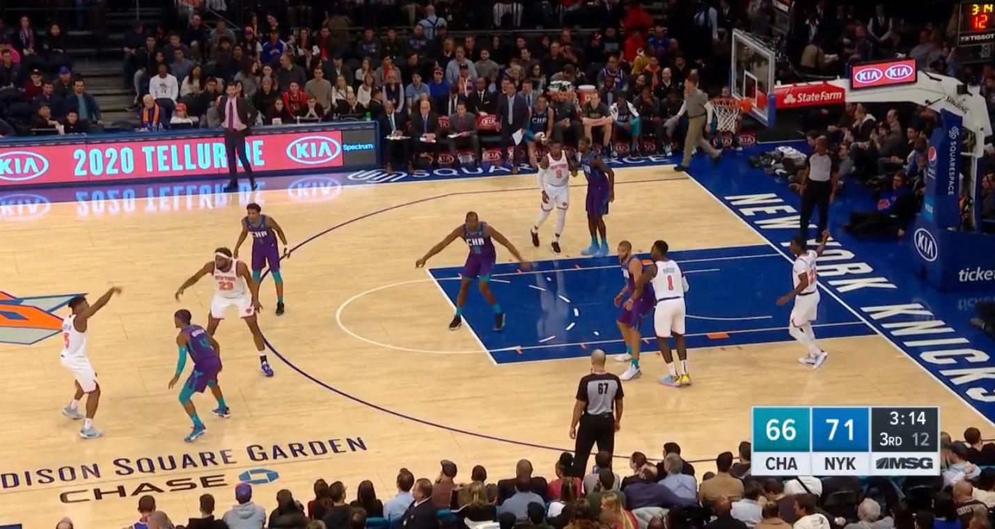 Under Miller—whose Westchester Knicks teams finished in the top four in the G League in defensive efficiency three times in his four years at the helm—New York has moved more frequently to straight-forward drop coverage against pick-and-rolls. It’s an approach that makes a ton of sense, given New York’s personnel. Point guards Elfrid Payton and Frank Ntilikina are both big, long, and capable of harassing ball handlers from behind with “rear-view” contests. Taj Gibson’s a smart positional defender well-versed in the multitasking required to mind his rim-rolling counterpart while also deterring dribble penetration. Mitchell Robinson is an überathletic shot-blocking behemoth with a condor’s wingspan who can panic drivers on every foray into the paint. Young wings like RJ Barrett and Kevin Knox, who have the size and athleticism to influence plays, get to focus more on just trying to execute one or two things well and worry less about trying to remember a dozen different responsibilities.