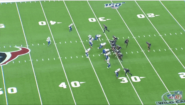 2. We’re going to spend the rest of the Starting 11 looking at the players who shaped the wild-card round—in ways good and bad. That starts with the Titans’ hulking, bruising RB. Tennessee’s offensive line did an excellent job opening holes for Derrick Henry (and we’ll get to them), but the 248-pound back also created plenty of space on his own against the Patriots. My favorite Henry run on Saturday came early in the fourth quarter, on a first-and-10 from the Titans’ 44-yard line. Tennessee lined up in a jumbo formation with three tight ends and handed the ball to Henry on a gap run. Nose tackle Danny Shelton managed to shake free of right guard Nate Davis and meet Henry in the hole, but Henry was able to bounce outside thanks to a nice block from tight end Jonnu Smith. Running with a full head of steam, Henry was left one-on-one with cornerback J.C. Jackson, who wanted no part of tackling him in the open field. Watch the clip below. Jackson is running away from a guy he’s supposed to be tackling. It’s incredible, but it’s also the reason that Henry is such a weapon for the Titans as they’re trying to put games away. He carried the ball 34 times on Saturday, and trying to tackle that guy 34 times is just a miserable experience for any defense. Despite Henry’s excellent day, Tennessee put up just 14 offensive points, which illustrates the problems of relying on a running back as your main source of production. But it’s important to acknowledge the small, mental advantages that a punishing run game can give a team during a game. The ability to lean on Henry is a luxury for the Titans.
