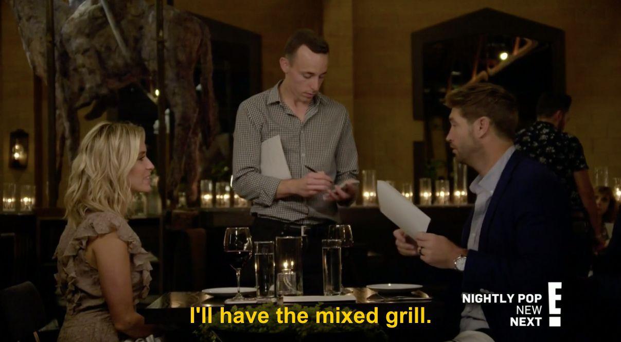 In the very first episode of this show, Jay Cutler ordered an assortment of exotic game from a similarly fancy Nashville restaurant; he once had a cooler full of random meats. Whatever item on your menu promises the most amount of grilled meats—that’s what Jay Cutler’s ordering.