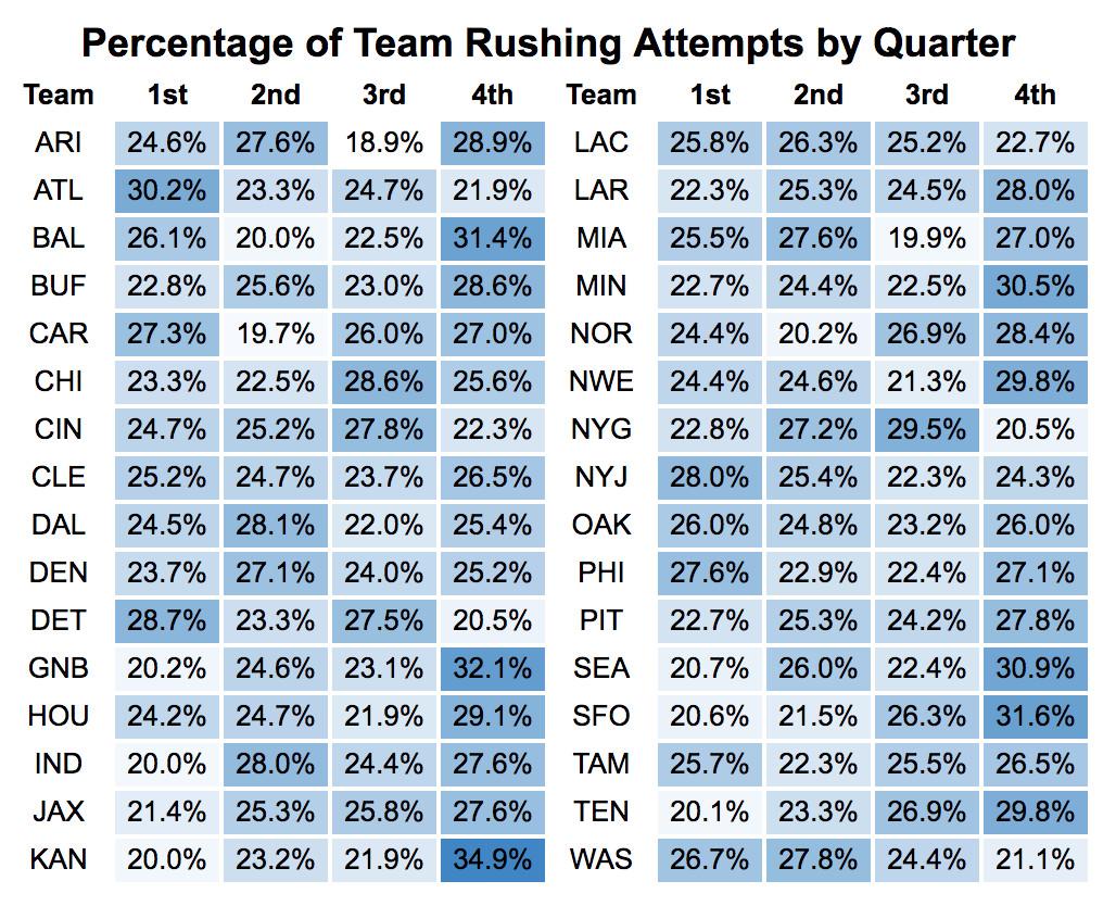 While teams that frequently hold leads (i.e., the Chiefs, Packers, 49ers, Ravens, and Seahawks) are the most intense fourth-quarter rushing teams, Kansas City stands nearly 3 percentage points higher than anyone else. Plus, only 20 percent of their rushing attempts come in the first quarter. Simply put: This team doesn’t even pretend to “establish” the run.