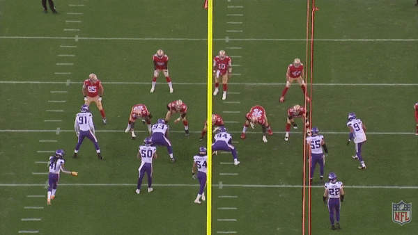 That knack for toying with a defense’s expectations is the foundation of what makes Juszczyk so useful to the Niners offense. His movement skills in the run game allow the Niners to try blocking schemes that other teams wouldn’t even consider, and those wonky wrinkles add layers of deception to an offense that’s already tough to figure out. My favorite Juszczyk play from the NFC championship game came on a big run by Deebo Samuel in the second quarter. The Niners are lined up in a heavy 22 personnel package (two running backs, two tight ends, and one wide receiver) with Juszczyk as an I-formation fullback. Juszczyk shuffles in motion to the right, and at the snap, he flies across the formation toward Smith on the left edge. This type of action would typically indicate a power play in San Francisco’s scheme, but instead of kicking Smith out, Juszczyk gives a quick head fake and peels around to the outside. It’s a sneaky move designed to play on Smith’s assumptions, and it works like a charm. Bracing for contact, Smith squeezes down hard and gives Samuel a wide-open path to the corner for an 11-yard gain.
