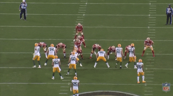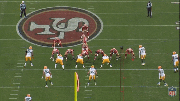 On this play midway through the first quarter against Green Bay, Juszczyk motions from the backfield to a wide receiver alignment on the right side. Because cornerback Kevin King follows Juszczyk toward the sideline, Garoppolo knows that he’s throwing into a zone defense. At the snap, Juszczyk runs a quick 5-yard in route, with Samuel running a deep dig behind him. Rather than ignoring the fullback, linebacker B.J. Goodson drives on Juszczyk, which frees up space for Garoppolo to rifle a throw to Samuel for a 30-yard catch and run.