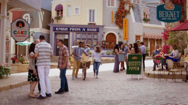 Take food, for instance. No one in the Good Place cooks; all meals happen in restaurants. (Who knows, maybe spending time in the kitchen on Earth costs people points.) In this version of heaven, dinner is served with a side of puns: “Lasagne Come Out Tomorrow,” “The Pesto’s Yet to Come,” and “You Do the Hokey Gnocchi and You Get Yourself Some Food.” In one iteration of the neighborhood, all the restaurants are stick-themed: “Hot Dog on a Stick on a Stick,” “Bagel on a Stick,” “Caviar on a Stick.” In the background, a woman walks by carrying a bagel on a stick and a sign advertises “Extra sticks.”