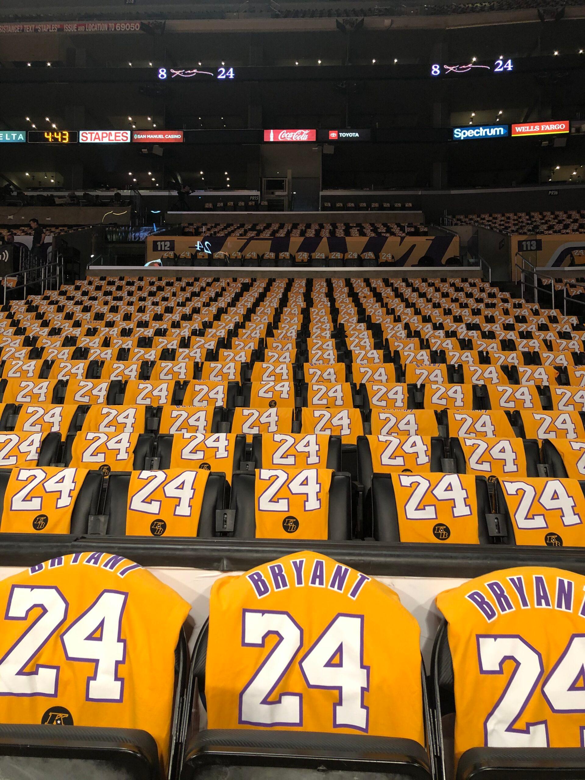 Inside, things only seemed more surreal. Two-sided T-shirts were draped over each seat—no. 8 Bryant on the front, no. 24 Bryant on the back—except for the two seats courtside that had been left empty for Kobe and Gigi. Those seats, where the two had sat in late December to watch the Lakers play the Mavericks, were occupied by their respective jerseys and bouquets of roses.