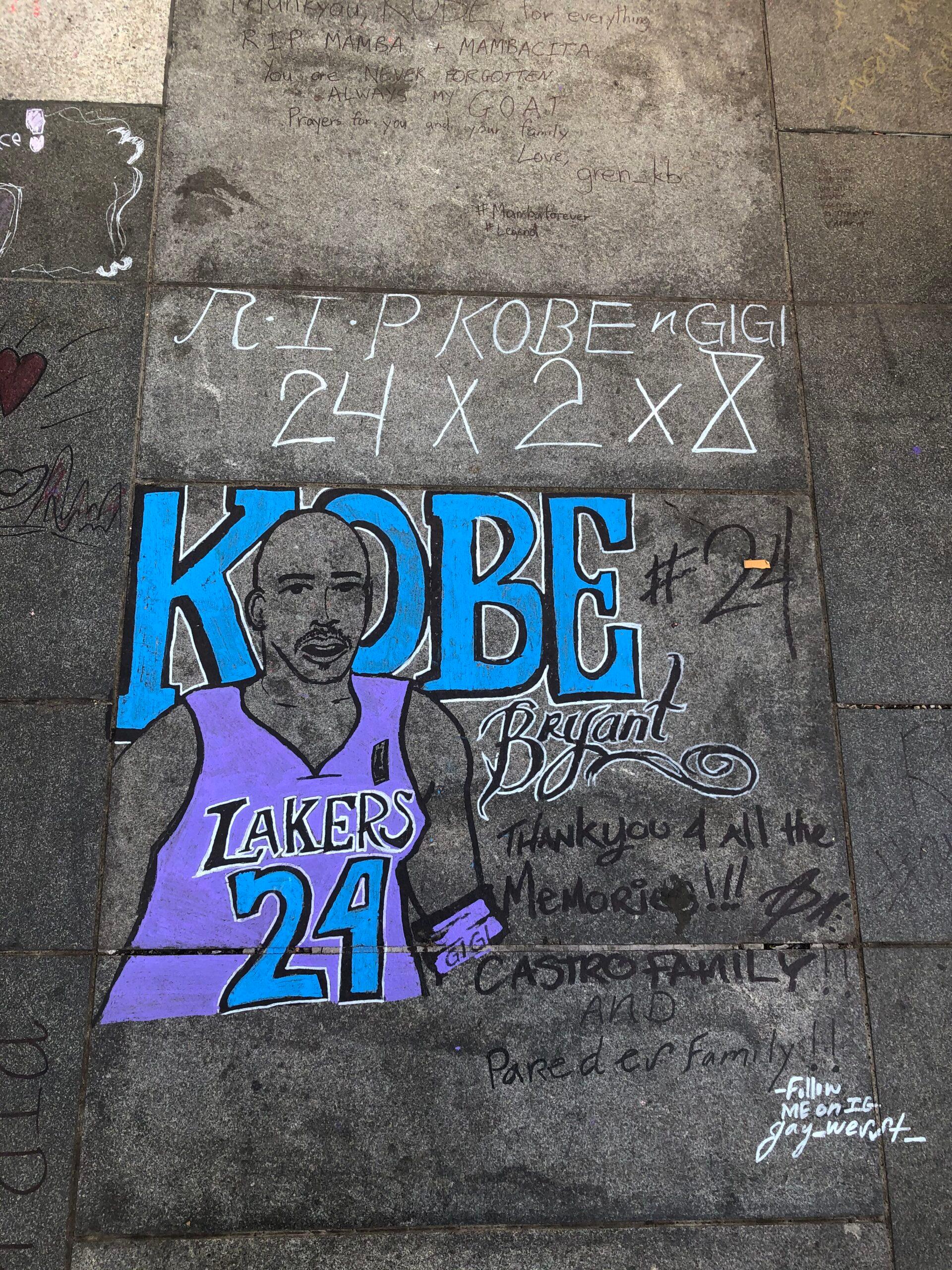 The evening had been plenty heavy already. Outside, L.A. Live was as packed as it had been all week, even though the Lakers had told fans that the game wouldn’t be shown on the outdoor screens. They weren’t there to watch basketball, anyway. Sixteen large white canvases stood along Chick Hearn Court, and they were filled with messages for both Kobe and Gigi. The plaza was packed on both sides with flowers, candles, letters, paintings, frames, jerseys, shoes, and notes, and the concrete floor itself had been turned into a canvas where fans had written out messages and painted Kobe’s face. This place no longer belonged to AEG, the company that owns Staples Center. It had become the fans’.