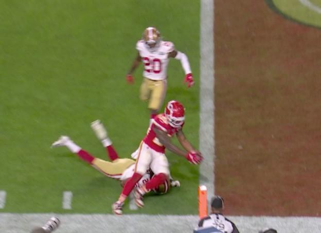 Williams’s foot is clearly out of bounds, and the ball seems millimeters past the goal line. It seems he probably stepped out of bounds before he extended the ball across the plane, but it was a classic example of sticking with the call on the field because there was no definitive answer. Still, it is odd that what was ultimately the winning touchdown in the Super Bowl may not have been a touchdown. Would Andy Reid have gone for it on fourth-and-goal at the 1-inch line to take the 24-20 lead? Would he have kicked the field goal to tie the game? Would the 49ers defensive line have been able to stop them if the Chiefs had gone for it?