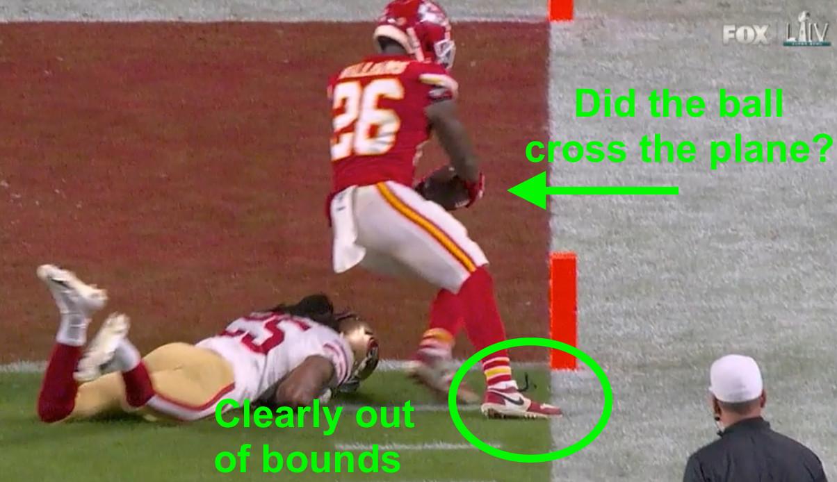 But it was clear that Williams had stepped out of bounds at almost the same moment he extended the ball into the end zone. Would the Chiefs get the game-winning touchdown upon review? Or would they have a fourth-and-goal just inches away from the end zone? For an event watched by more than a hundred million people, there weren’t many camera angles to figure this out. The angle facing the front of the end zone clearly showed Williams was out of bounds, but offered no depth perception to show whether the ball was in the end zone.