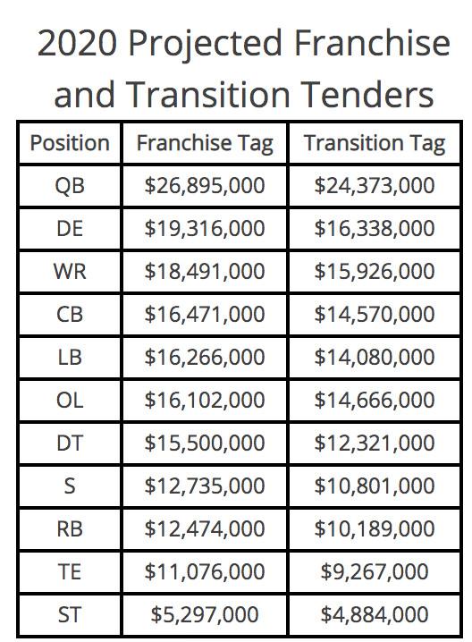 This year, teams can use two versions of the tag. The regular franchise tag is still an option, but teams can also use the transition tag. The transition tag is for slightly less money than the franchise tag and allows a player to sign elsewhere, but the original team has the right to match any offer from a different team. If the original team declines to match the offer, they don’t get any picks back. Here are the specific prices as projected by the salary cap website Over the Cap.