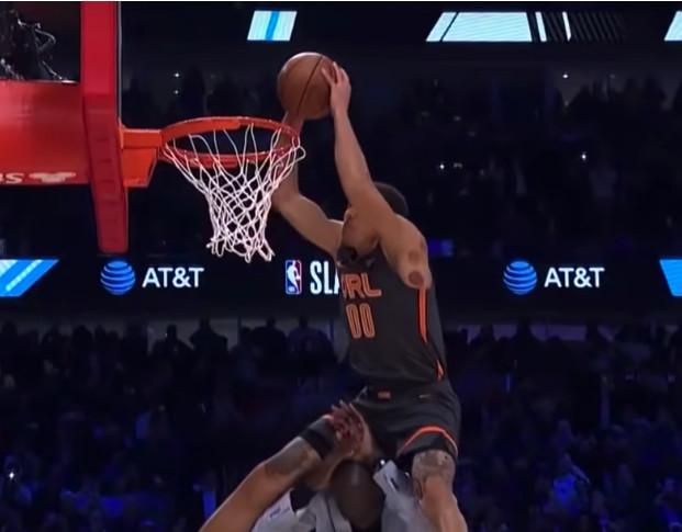 Derrick Jones Jr., celebrating his 23rd birthday, opened up by windmilling between his legs over two people. Aaron Gordon responded by terrorizing Chicago native Chance the Rapper. Just look at Chance’s face as it makes the journey from nervousness to “I just peed myself” to “Thank god I’m alive” in less than two seconds.
