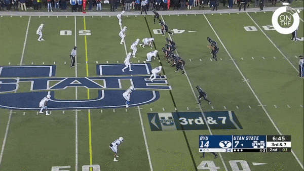 Love’s gaudy interception total didn’t stem from one particular deficiency. When you throw a pick on 3.5 percent of your throws, they tend to happen a lot of different ways. Most troubling was his tendency to miss—or ignore—underneath defenders. A staggering number of Love’s turnovers came on throws that went directly to a linebacker parked in the middle of the field. To understand the duality of Love as a prospect, take a look at these two throws against BYU. The first one came on third-and-7 with the Aggies just inside BYU territory. After initially looking at his receiver running up the seam in a four-verticals concept, Love pulls back and rifles a late hole shot down the right sideline. It’s the sort of throw that most quarterbacks couldn’t even fathom.