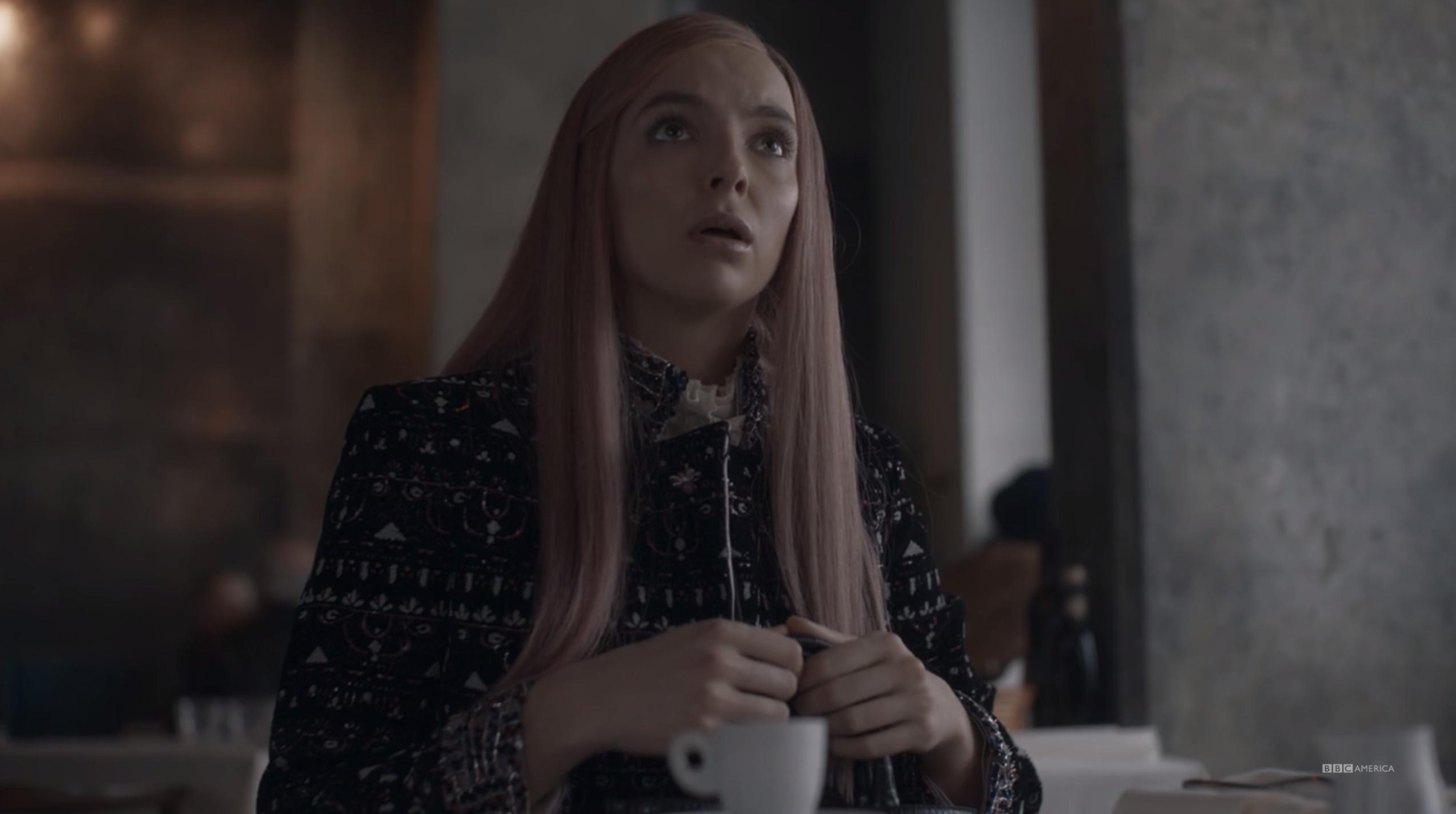 The first time we see Villanelle, she’s in a black sleeveless blouse and a dark wig, incognito (sort of) in an ice cream shop. As soon as her assassination is complete, Villanelle spruces up her disguise with a pink overcoat and ditches the wig. Much better.