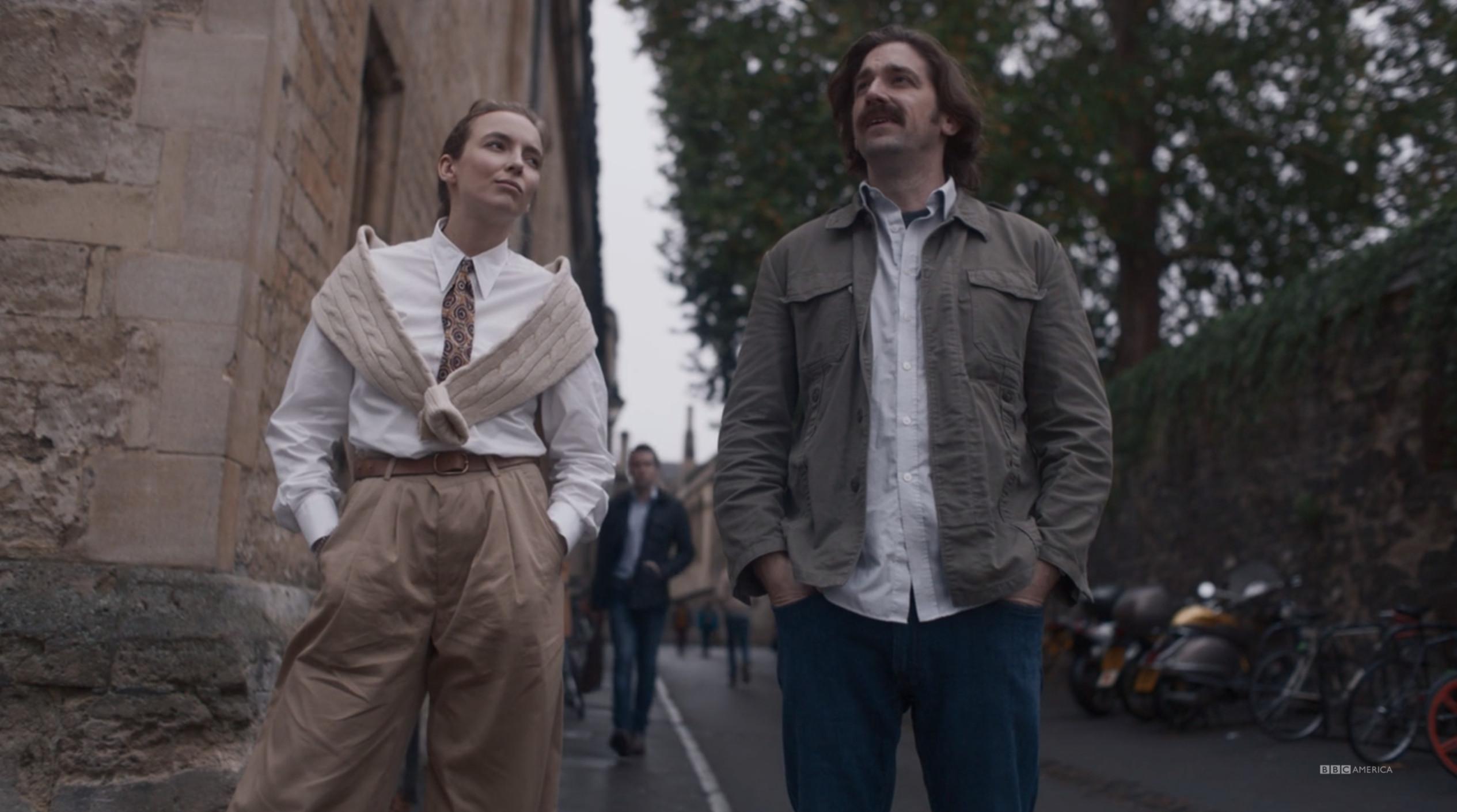 Aaron Peel gives Villanelle this jacket along with an entire closet of new clothes, then commands her to “touch it” during lunch in Italy. Weird, but I too would like to touch it, so he has a point.