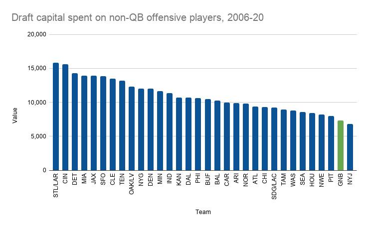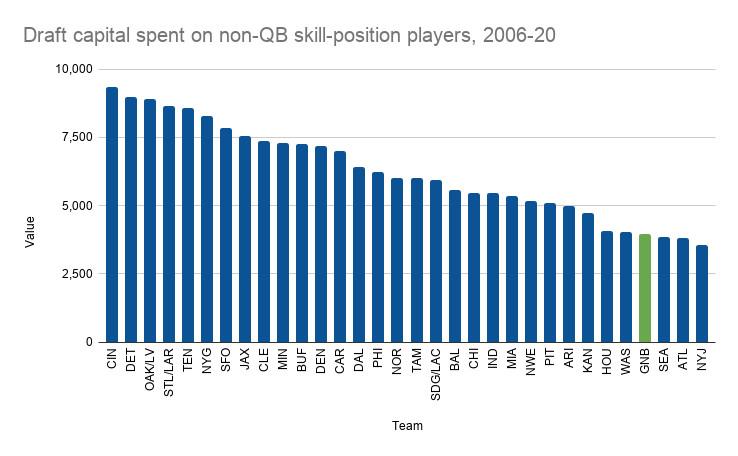 Between drafting Rodgers in 2005 and Love in 2020, the Packers used zero first-round picks on offensive skill-position players. That alone looks like a pretty glaring lack of support for a future Hall of Fame quarterback. The Packers would surely counter with the second-round talents they stocked up on through the years—Jordy Nelson (the 36th pick in 2008), Randall Cobb (64th, 2011), Eddie Lacy (61st, 2013), and Davante Adams (53rd, 2014)—but on the whole, the team’s investment in offensive weapons pales in comparison to nearly every other franchise. Since the 2006 draft, the Packers rank 29th in total draft capital (as measured by the traditional Jimmy Johnson draft chart) spent on non-QB skill-position players (i.e., wide receivers, running backs, and tight ends):