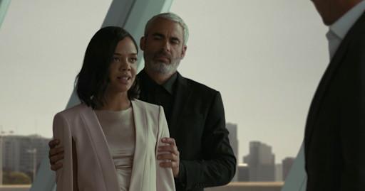 Not only is the outfit the same, but the meeting is the same. The topic for both is taking Delos private. In the sixth episode, this meeting goes disastrously as Serac ousts Charlotte. In the first episode, Serac is an absentee board member voting from an empty chair, and the meeting goes seamlessly. Even stranger, Charlotte’s purse ends up in the same spot during both meetings. In the season premiere, she puts her purse on the table:
