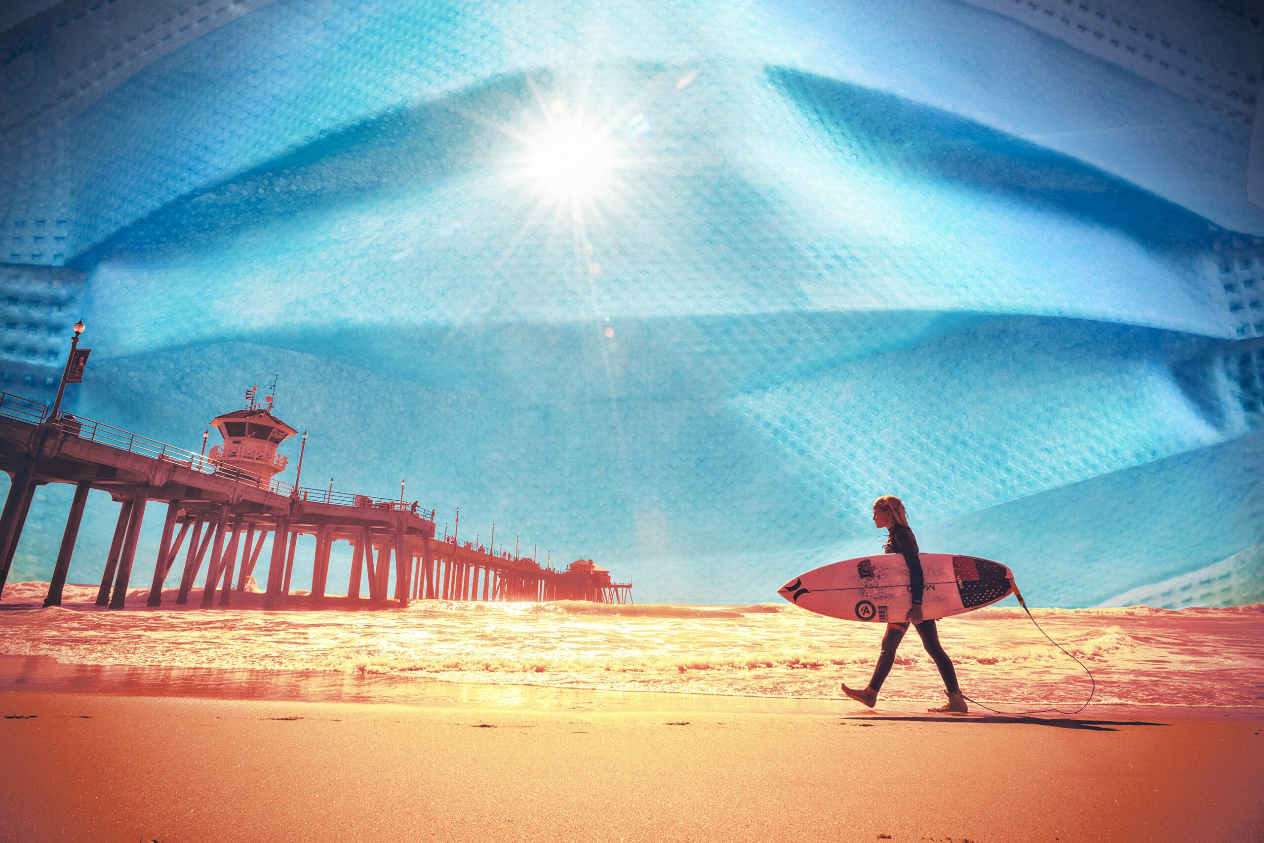 I live in Huntington Beach. But I have yet to become one with the beach, metaphysically speaking. To prepare for an afternoon of reporting, I grabbed flip-flops and swim trunks (both nearly unused). In a flourish of professionalism, I pulled on a gray polo shirt. I wore a black mask over my mouth. Sitting on the sand near the pier, I looked like a public relations official for the narcos or (at best) a cop.