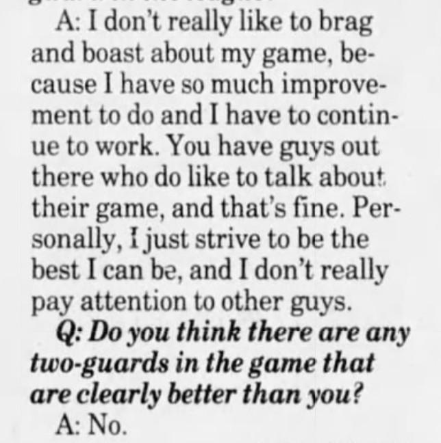 After sifting through years of mentions, it’s obvious how quickly the “next Jordan” moniker became a crutch to try and describe any young basketball players who showed any kind of upside. Some, like Roy Marble (who played only two seasons in the league) and Ron Henderson (who never made the NBA), got it more than others. Dikembe Mutombo got it once. Latrell Sprewell got a couple of mentions, as did Glenn Robinson, Ron Mercer, and high schooler Ronnie Fields. At some point, Scottie Pippen felt it was necessary to say he wasn’t trying to be the next Jordan. Ron Harper was called the “next Jordan” when he was entering the league and eventually became Jordan’s teammate in Chicago. Jordan, of course, teased him about the nickname. And Antoine Walker made it a point to say that he thought the Celtics’ style wouldn’t help him become the next Jordan. During the 1998-99 lockout, one writer in Detroit quipped that the best part about no basketball was no daily “next Jordan” story.