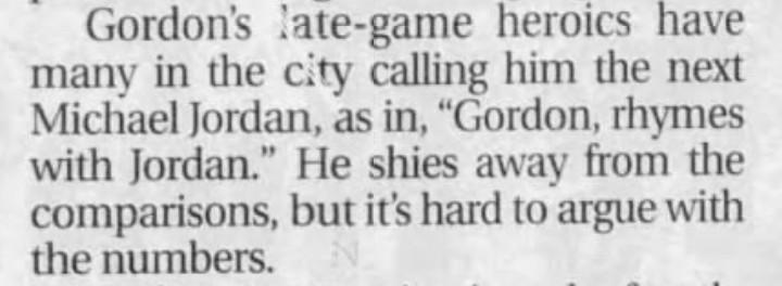 As the NBA entered the dark ages of the late ’90s and early 2000s, desperation to find the next big star set in. Here’s a list of other notable names who got called the next Jordan at least once during that time: Steve Francis, Corey Maggette, Elton Brand, Gerald Wallace, Michael Redd, Darius Miles, Tracy McGrady, Richard Hamilton, and Ricky Davis (three separate times, all by Cavs coach John Lucas). My favorite might be Ben Gordon, who after a run of clutch shots in 2005, prompted this paragraph, from an AP piece: