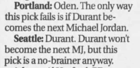 First Mention: On June 28, 2007, otherwise known as the day of the 2007 draft, Durant got the “Next Jordan” tag in multiple places. In one article, he was said to be the next Kevin Garnett and to possess Jordan-like potential. And another—one that’s aged extremely well—argues that he should be the no. 1 pick because “you never want to risk passing up the next Michael Jordan.”