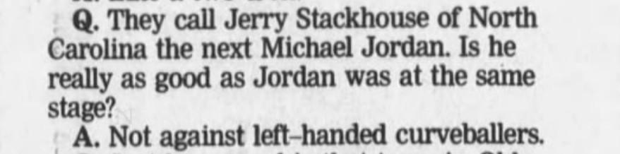 First mention: If you’re a Florida State fan, you are probably one of the few people who remember the first time Stackhouse was called the Next Jordan. That’s because it happened in the Tallahassee Democrat in 1992, when Stackhouse was expected to commit to play for FSU. Sorry, Seminoles.
