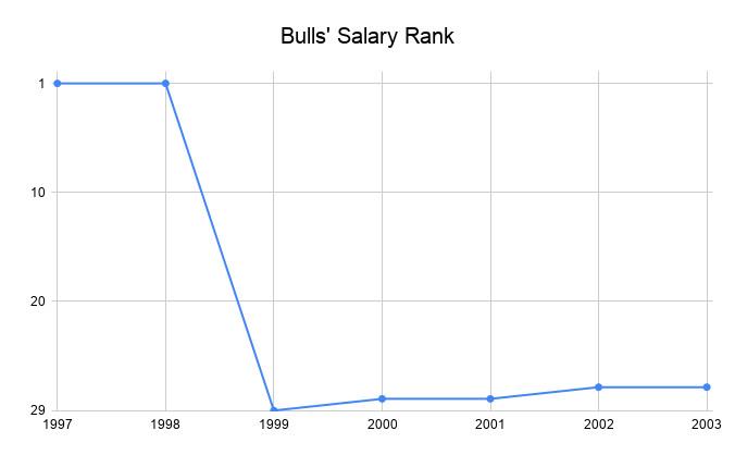 By the start of the 1998-99 season, the only previous champion in league history to miss the following postseason was Boston after Bill Russell and Sam Jones retired. And at least those Celtics, with multiple future Hall of Famers still on the roster, finished a respectable 34-48 with a near-even point differential. The 1998-99 Bulls could make no such claim.