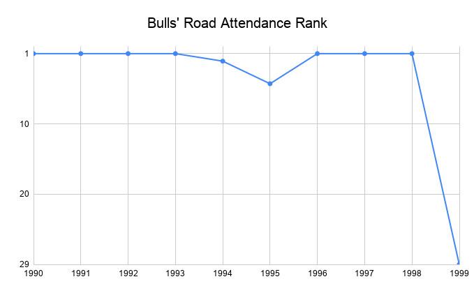 Scalpers had to offload Bulls tickets for one-tenth the price of the previous season. The drop-off in attendance for away games was as extreme as possible. The Bulls ranked first in road attendance every season in the ’90s that Jordan played, dipping to second and fifth in his baseball years. Then in 1999, according to Basketball-Reference’s data, the Bulls ranked 29th in road attendance in a 29-team league.