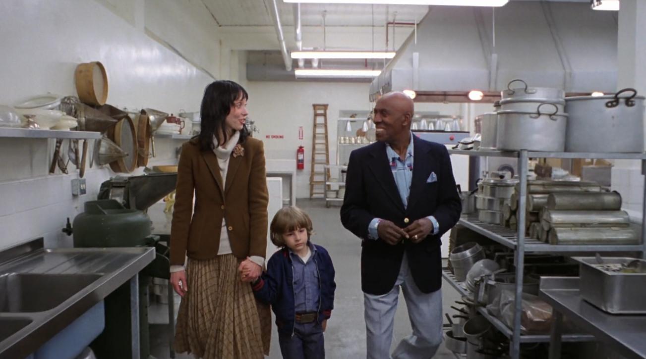 SCATMAN CROTHERS guides DANNY TORRANCE through a massive kitchen as WENDY TORRANCE catches up. The walls are lined with cooking supplies; long, stainless steel tables fill the room; there are multiple stoves, stand mixers, and 24-quart pots.