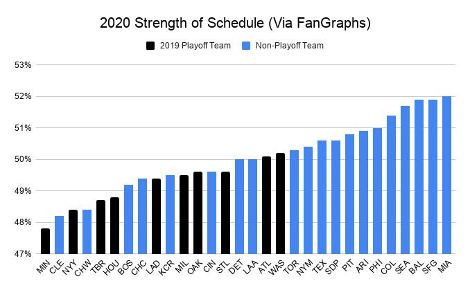 We can translate those strengths of schedule into more easily understood terms—wins and losses—by comparing two different records that FanGraphs projects for each team: its “true talent” record, reflecting the showing it would expect against a neutral schedule, and a second projection that accounts for the actual schedule. For instance, the White Sox have a natural winning percentage projection this season of .501, or a 30-30 record; their schedule-adjusted projection, however, is .523, which translates to 31.4 wins in 60 games. So Chicago would expect an extra win or two this season by virtue of its easy schedule alone.