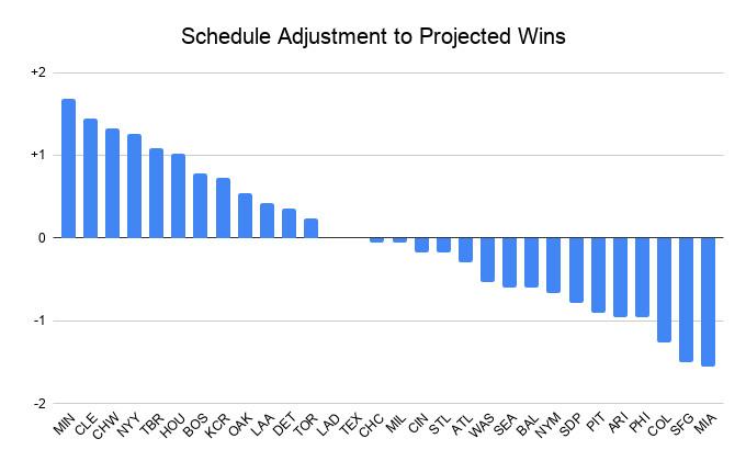 In comparing schedule-neutral and schedule-adjusted projections, the three teams with the largest positive gaps all play in the AL Central: Minnesota, Cleveland, and Chicago. If they’re all getting the same number of schedule wins, the advantage will cancel out in the division race—but it could certainly matter in the battle for the AL’s wild-card spots, with teams like the A’s and Angels reaping lesser scheduling gains. Here’s the full accounting (with a negative number meaning the team is projected to win fewer games because of its schedule than it would against a neutral field):