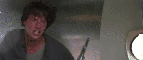 The lawn mower prevents Johnny from warning the other agents that the surfers are armed on his walkie-talkie, and a chaotic shootout ensues. If a standard shootout doesn’t sound gnarly to you, I would like to add that one of the women in the house comes out of a shot-up shower stall and beats the shit out of Johnny, which was iconic. (Alas, the sequence is not GIF-appropriate because she is totally naked.) And that pesky lawn mower almost takes out Johnny’s perfectly sculpted face.