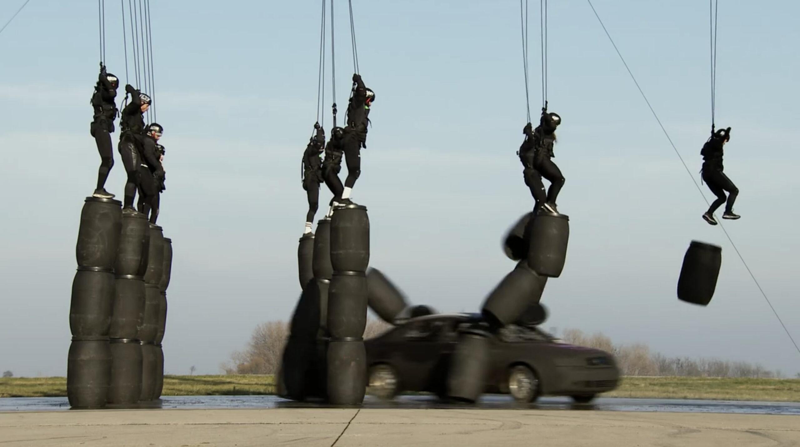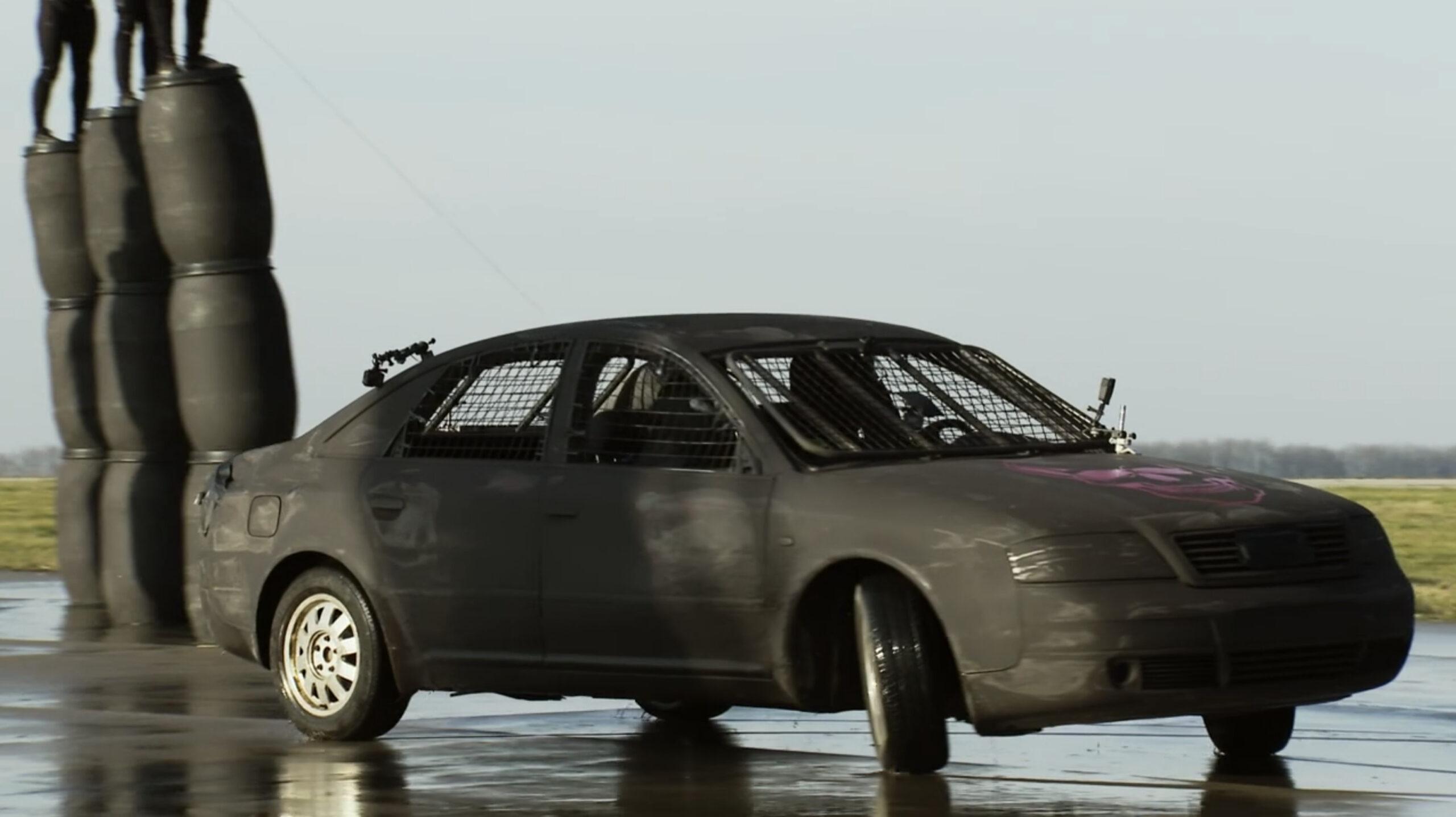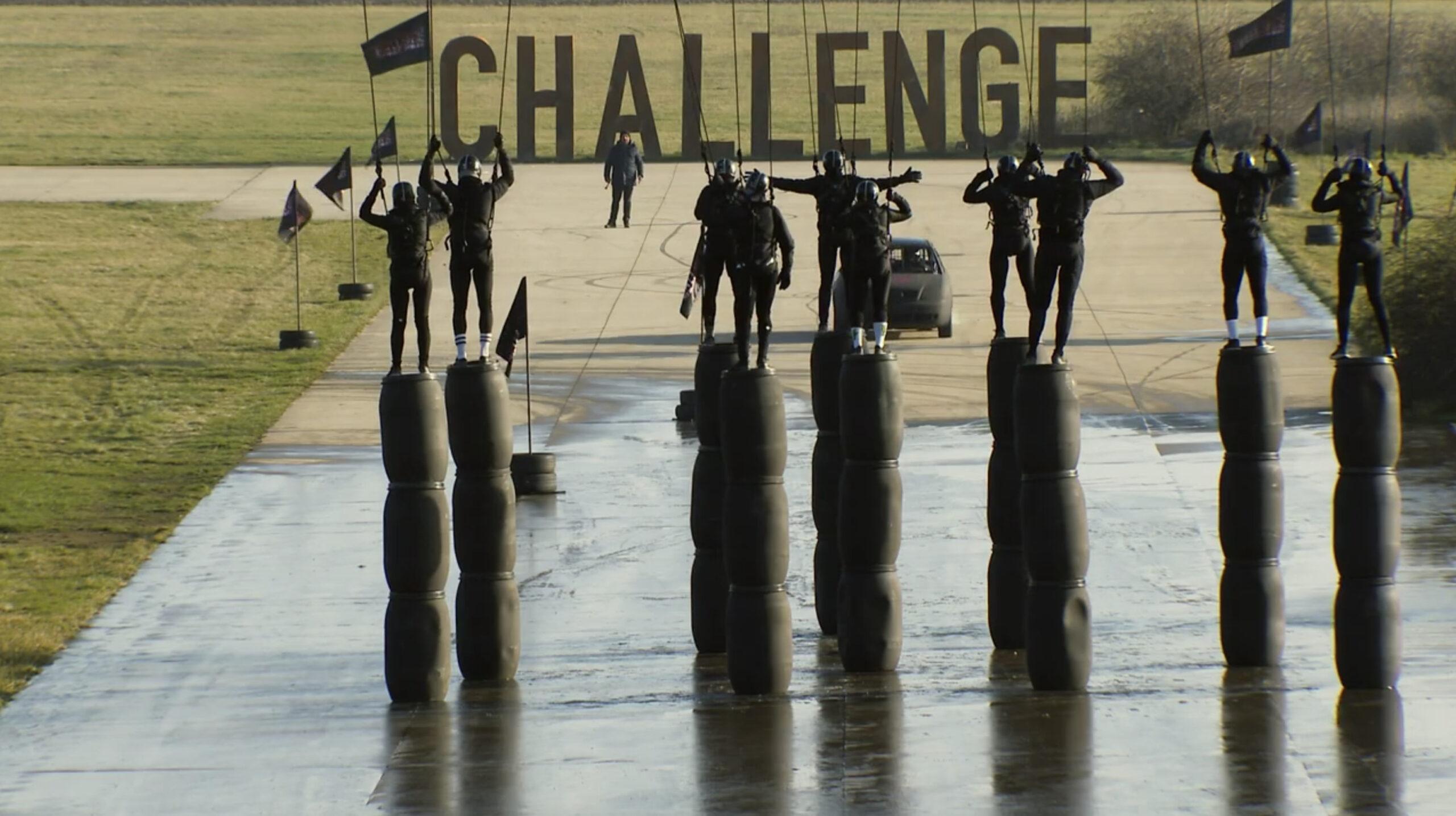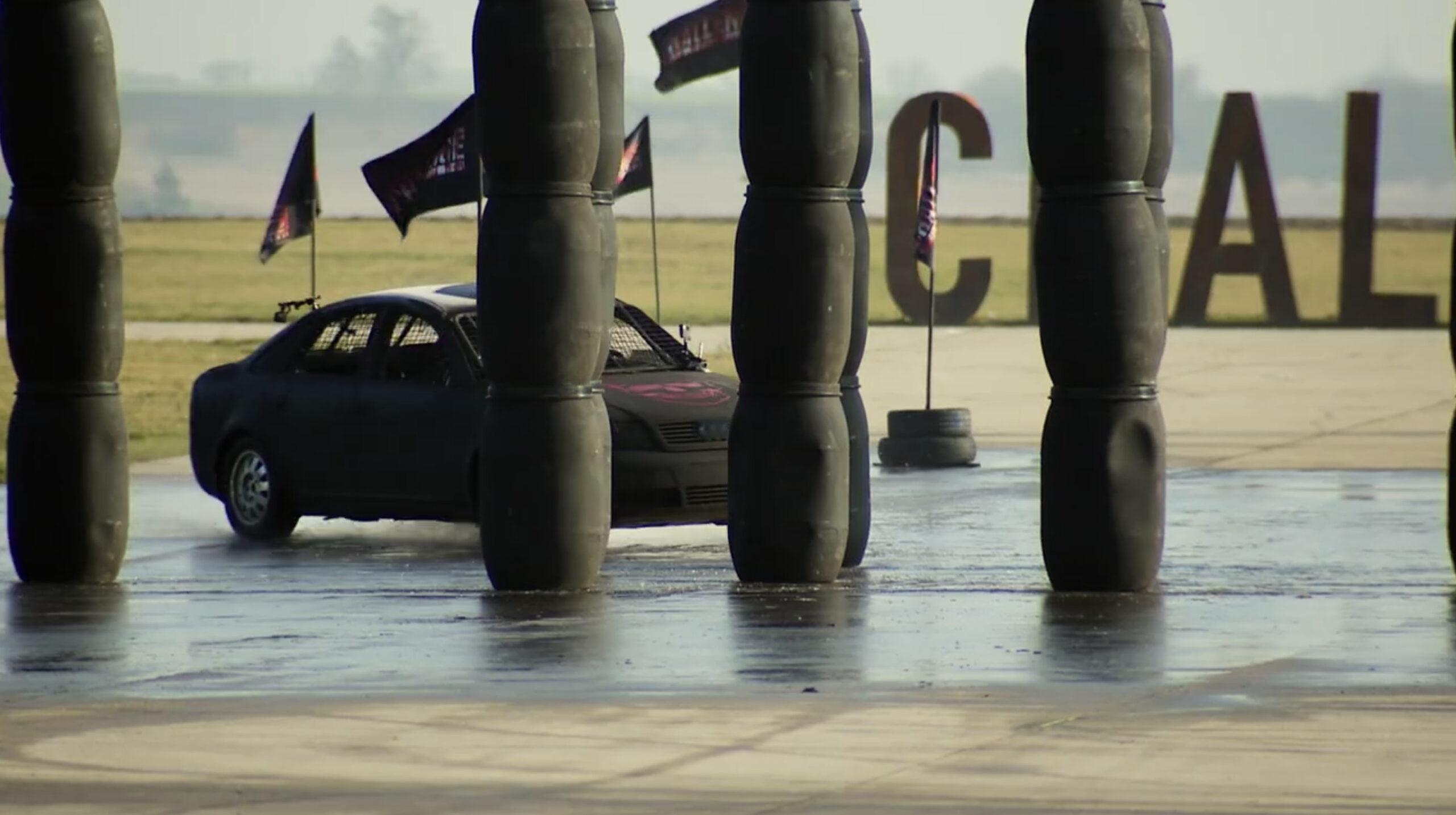 This week’s group challenge—and there was one more, despite what some overly optimistic competitors hoped—had contestants stand on a tower of barrels, while one contestant drove a car toward those towers at full speed, hitting the e-brake at the last second to spin out and topple as many barrels as possible. Like bowling, but faster and more furious.
