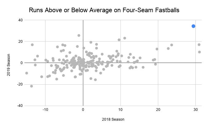 The most overpowering situation in baseball comes when a pitcher rears back and throws his best fastball and the batter can’t connect. Cole is thus the sport’s most overpowering pitcher, with a 97-mile-per-hour heater that features elite spin and induces more whiffs than any other starting pitcher’s fastball. This graph shows four-seam fastball success over the last two seasons for pitchers with at least 50 innings pitched in both campaigns, using FanGraphs’ pitch value calculations. Cole’s is the blue dot all alone in the upper-right corner.