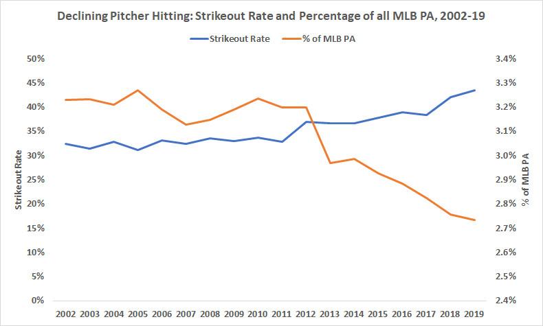 As pitchers have become increasingly overmatched at the plate, their strikeout rates have skyrocketed even faster than those of non-pitcher hitters. But as starters get yanked earlier in games, they make fewer trips to the plate. Last year, pitchers struck out in 43.5 percent of their plate appearances, but they accounted for only 2.7 percent of all MLB PA, which limited their ability to elevate the league’s overall K rate.