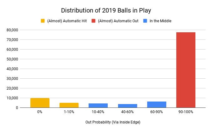 A key problem with evaluating defense is that most batted balls are either routine outs or definite hits. According to Inside Edge tracking data, nearly three-quarters of in-play batted balls last year were gimmes for even the lousiest fielders, turning into outs at least 90 percent of the time. Another large chunk were automatic hits that not even Gold Glovers could reach. It’s hard to demonstrate any sort of separation with those types of plays, and there are only a small percentage in the middle ground where fabulous fielders flash their skills and future designated hitters lag behind.
