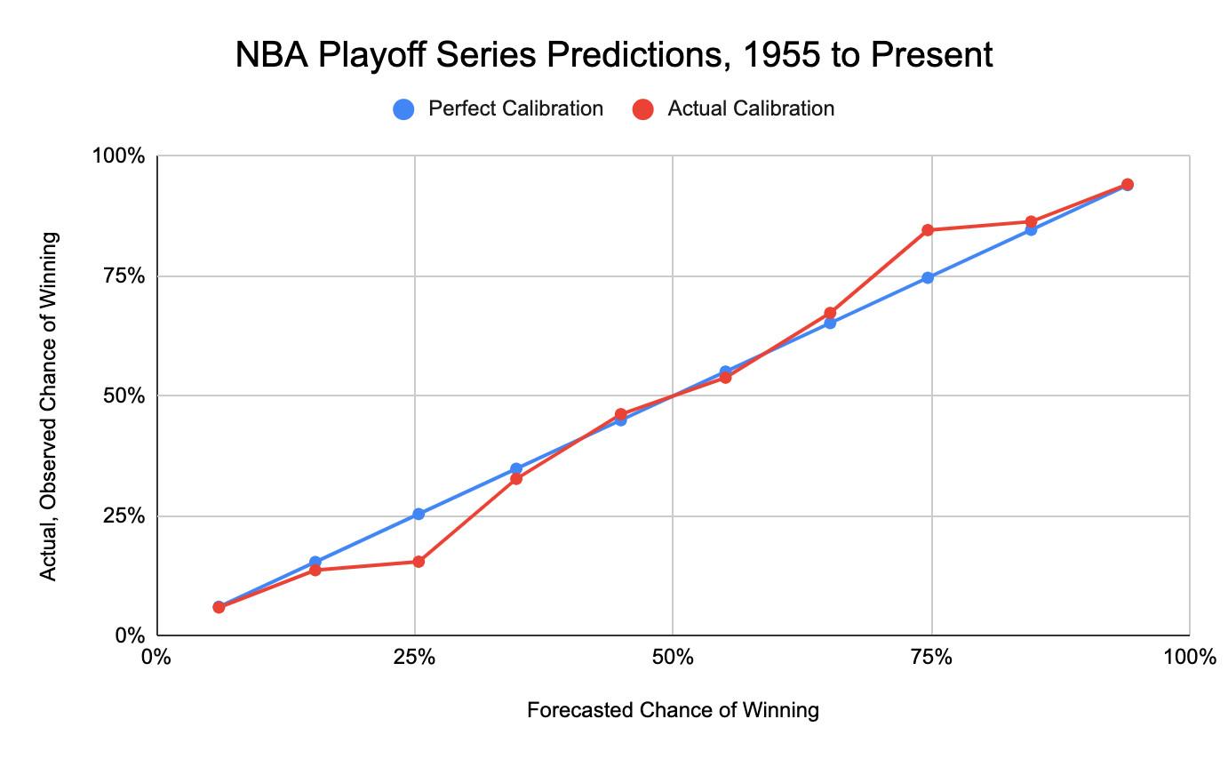 The structure of the model holds up well historically when back-tested against more than 700 series since the invention of the shot clock. For instance, the model would expect the biggest favorites to win 94 percent of their series, and indeed, 94 percent have; it expects the favorites in the closest series to win 55 percent of the time, and they won 54 percent. On this graph, the blue line represents a “perfect” model, and the red line is the actual result. Outside of one blip, the two lines track each other perfectly. (A similar blip appears in the same spot on a graph of FiveThirtyEight’s NBA playoff model. Reality is never quite as perfect as one would like.)