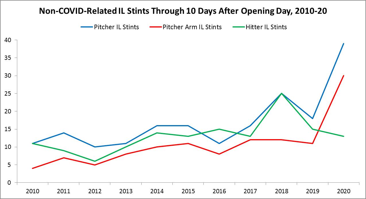 The graph below shows the number of combined pitcher IL stints, pitcher IL stints related to arm injuries only, and hitter IL stints on Opening Day and the next 10 days of each season dating back to 2010, according to MLB transactions data collated by Baseball Prospectus. This sample excludes any 2020 stints presumed or confirmed to be caused by COVID-19, as well as stints in all years in which a player was described as recovering from an earlier injury or was placed on the IL retroactive to a date before Opening Day.