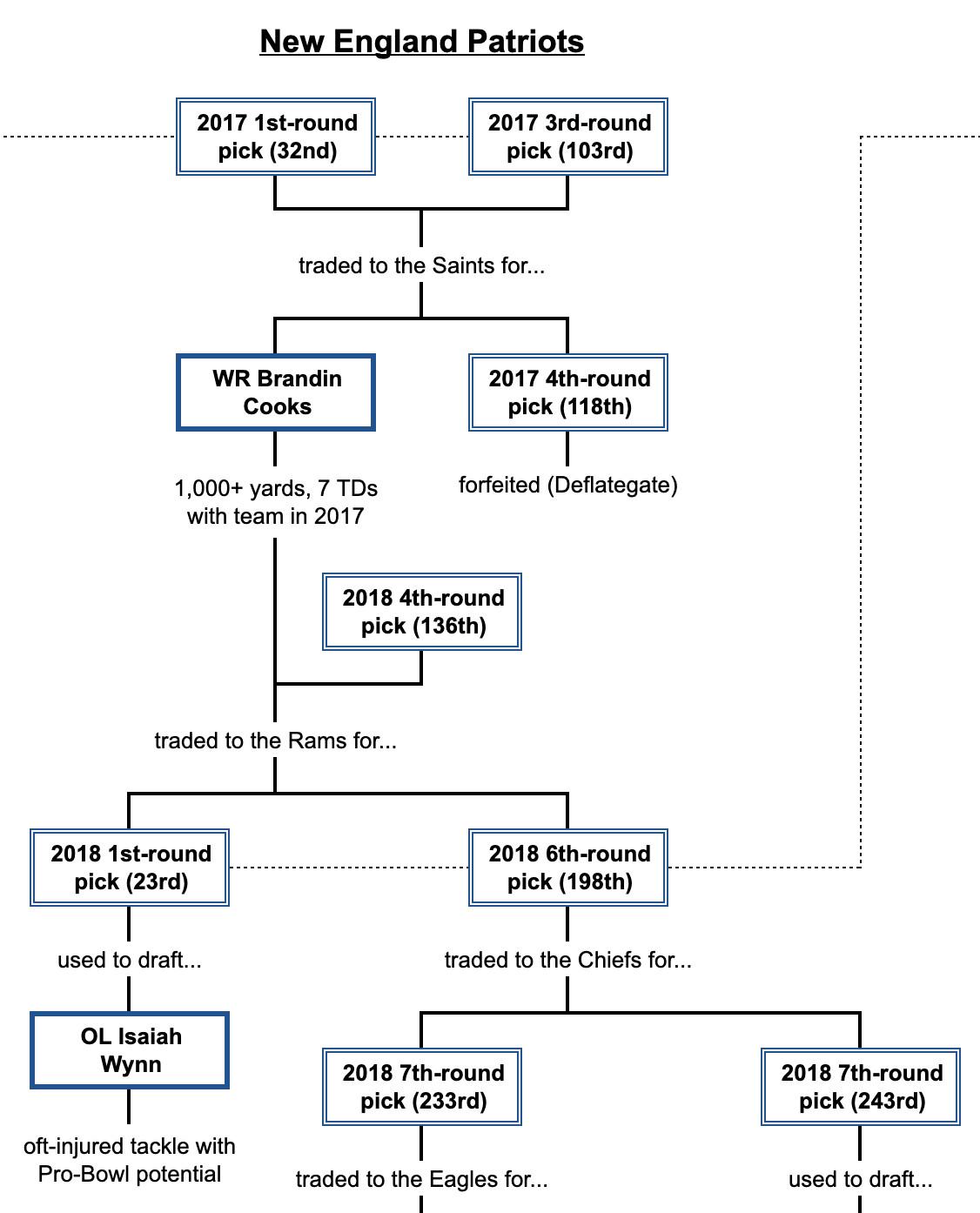 Cooks’s transaction tree is littered with teams that felt they were just one piece away from a run—and those situations didn’t always turn out the way the Saints-Cardinals swap did. Three years later, when the Patriots traded for Cooks, he helped lift their offense (the team jumped from second to first in DVOA) and guided them to a second straight Super Bowl appearance.